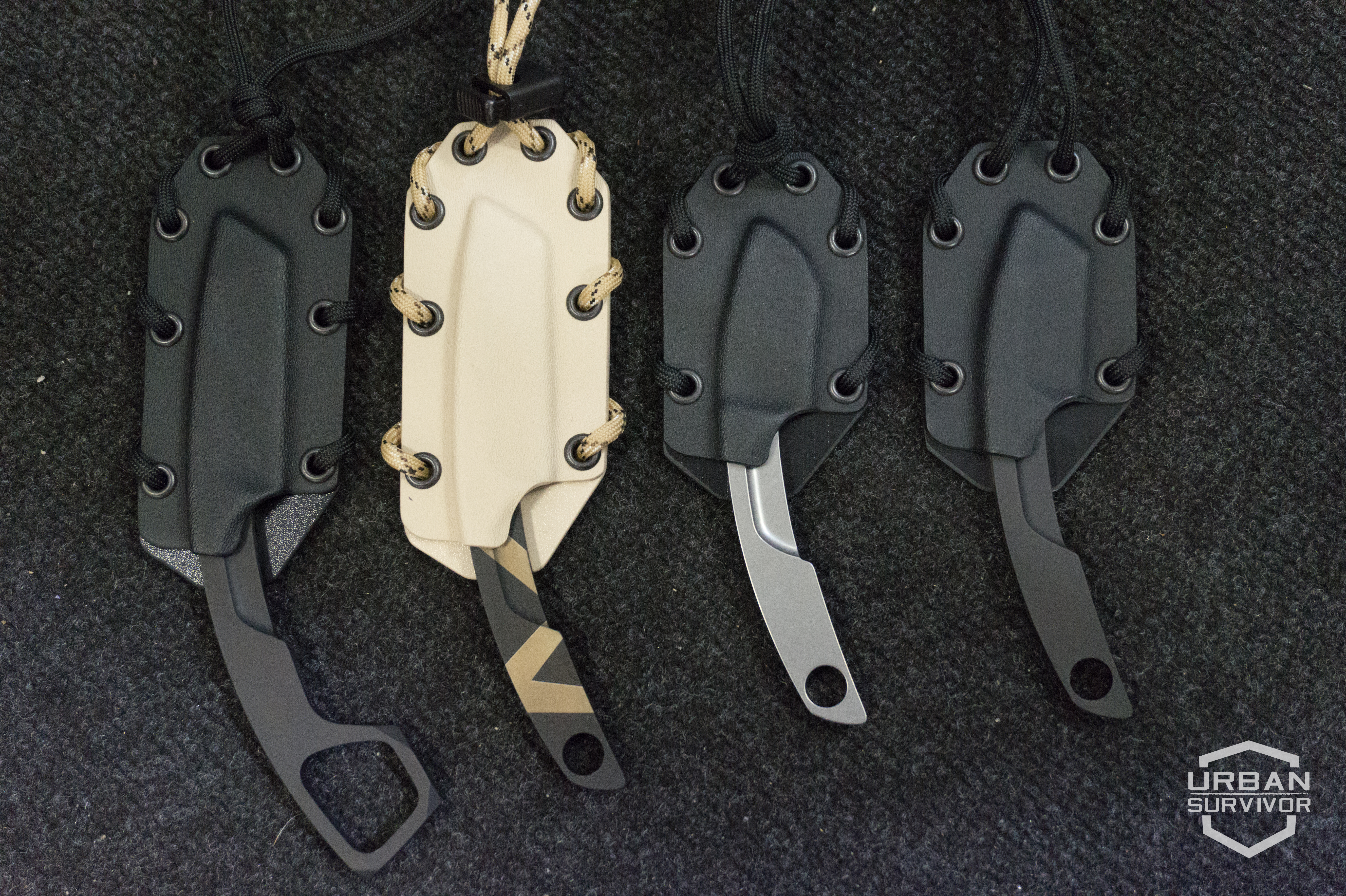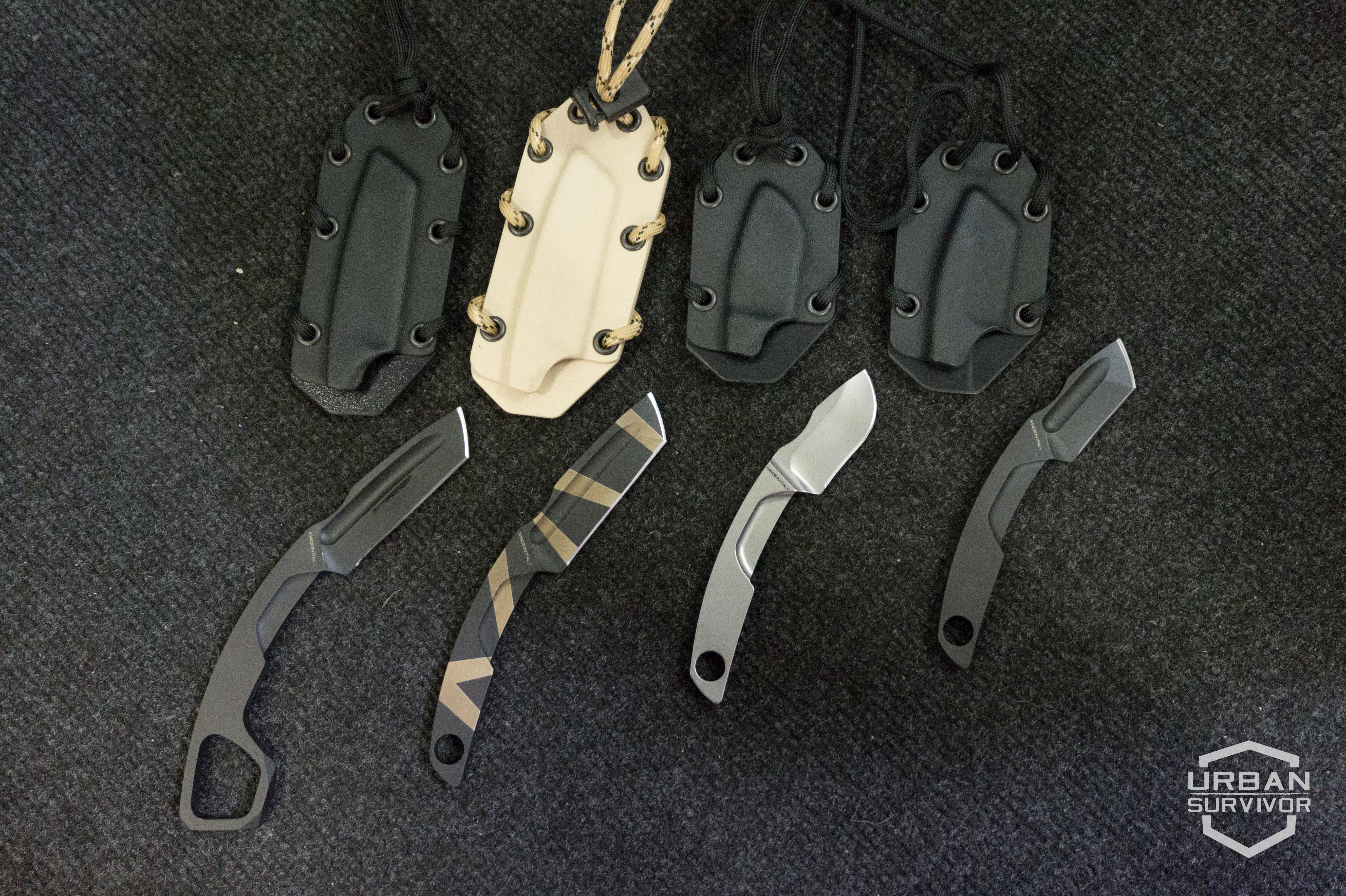 The Extrema Ratio manufactures four models of concealable neck or belt mounted knives that are very interesting for applications in urban environments. The four variants are N.K.1, N.K.2, N.K.3 and N.K.3 K (K stands for Kerambit). These fixed blade knives are made with BöHLER N690 steel (60HRC) and with a MIL-C-13924 burnishing surface finish (for the black version). The Extrema Ratio Neck Knives are available in Black, Desert Warfare and Stone Wash. For belt mounting solutions separately purchasable accessories are available from Extrema Ratio.