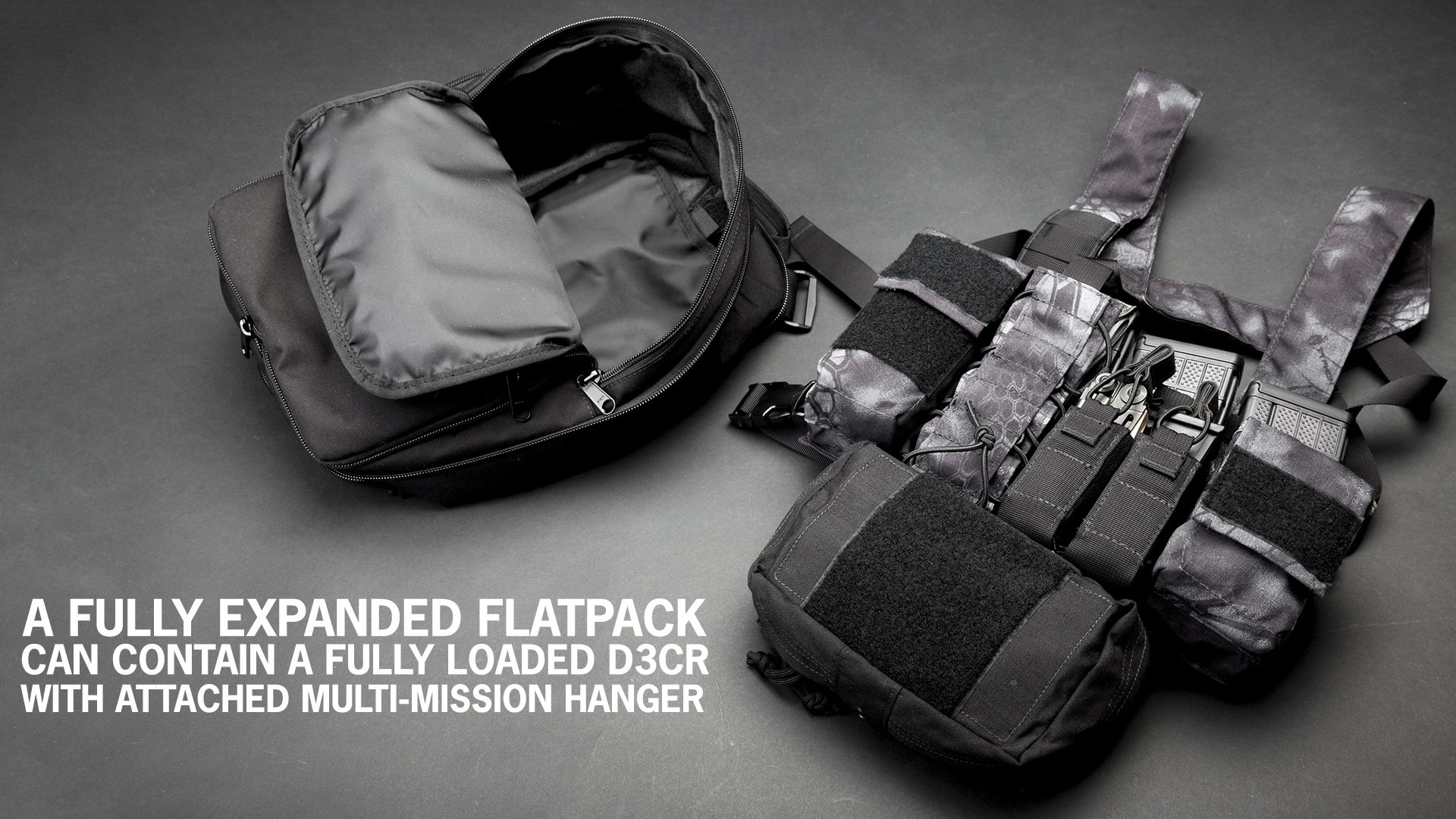 The D3 FlatPack can hold the HSP D3CR making it a very compact and reliable pack to carry a chest rig in a covert situation. During the transition from covert to overt, one the D3CR is deployed, the operator is able to slim back down the pack and integrate it with the chest rig, making this system a great site exploitation bag.